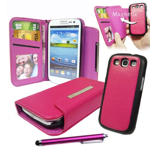 Love My Case Étui type portefeuille en cuir pour Samsung Galaxy S3, i9300 Avec coque rigide amovible, protection d'écran et stylet (Rose)